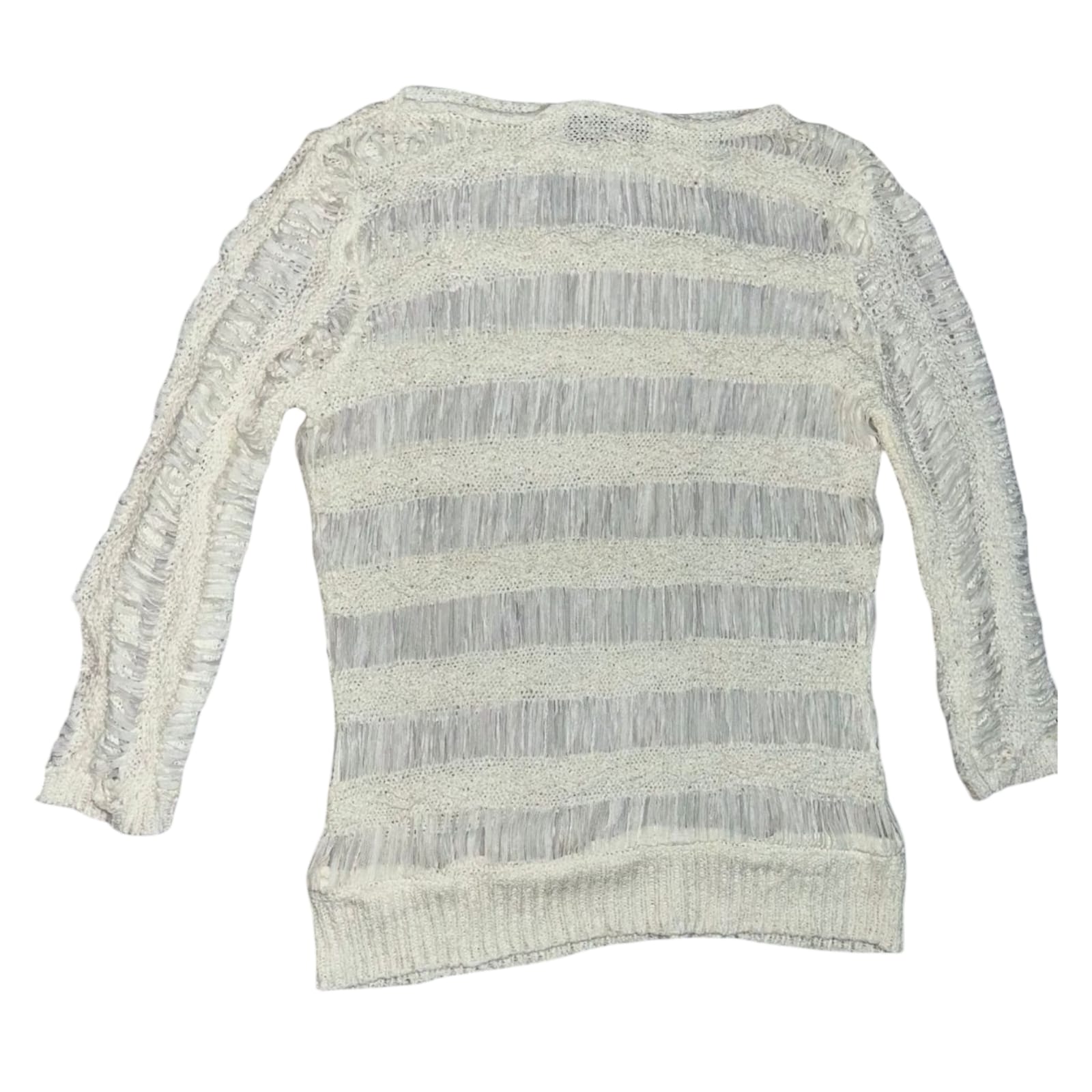 A beautiful off-white sheer open-knit sweater featuring striped texture and a wide neckline. This lightweight, breathable pullover is perfect for transitional weather layering and offers a relaxed fit.