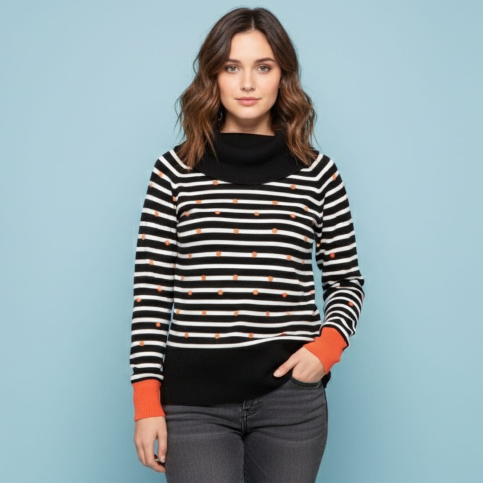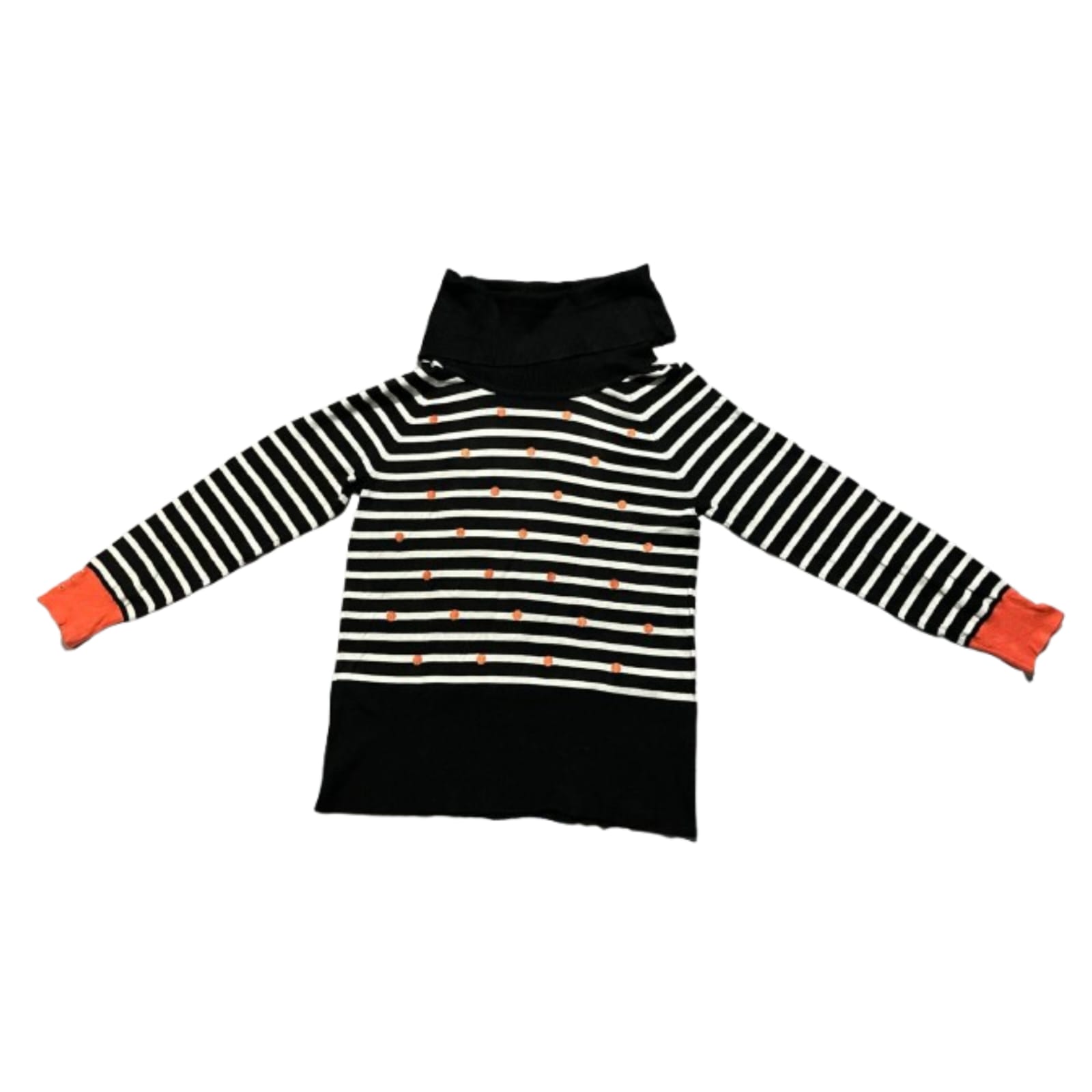 Fun black and white striped sweater with small orange polka dots and a cozy black cowl neck. Features vibrant contrast orange cuffs for a stylish, modern.